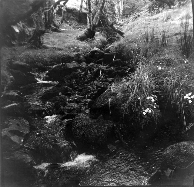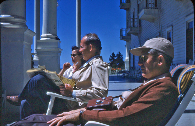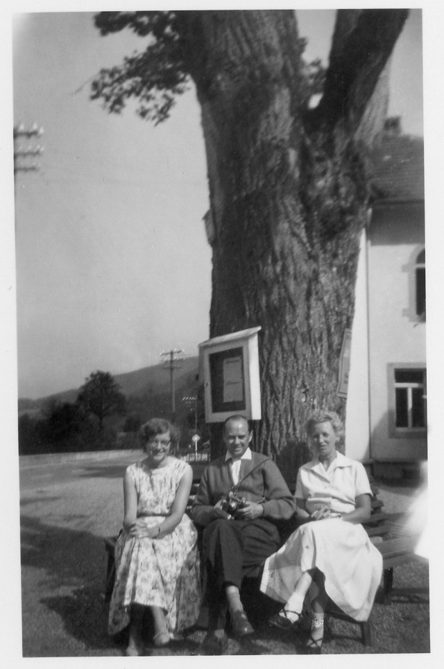 Man with a camera and two women, in the countryside, unknown location. 1950s