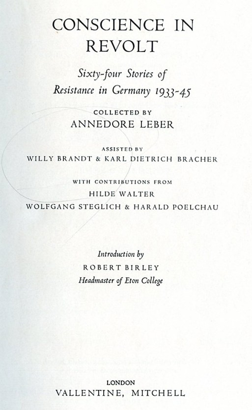 Conscience in Revolt, London 1957. First published in Germany in 1954 as Das Gewissen Steht Auf, Mosaik-Verlag, Berlin. An account of the various groups and individuals who, at risk to their lives, protested against and opposed Hitler and the National Socialists. Note the name of Willy Brandt above, who went on to become Chancellor of the German Federal Republic in 1969.