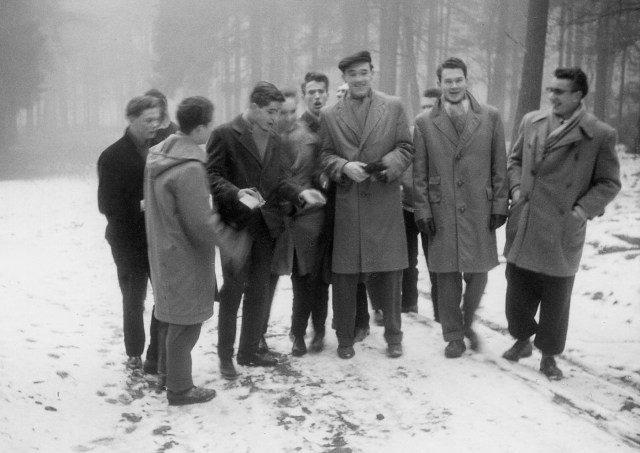 Group of male Germans in a snowy wood, circa late 1950s/early 1960s. Print processed by a photo dealer in Hamburg-Wandsbek.
