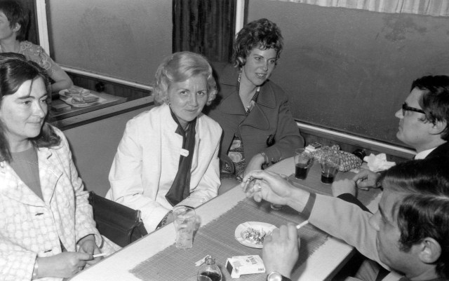 Women and men at a bar table, Hamburg. 1970. Atika brand cigarettes centre foreground. (Photo labs “1970” date stamp on reverse)