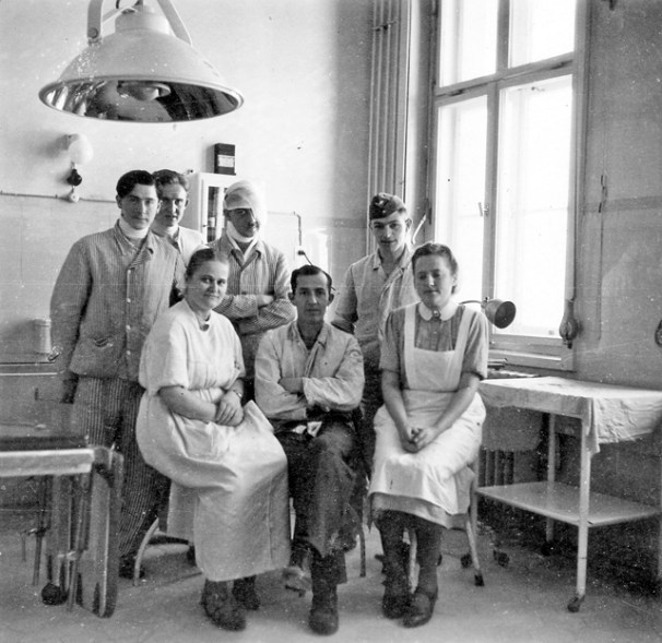 Injured German soldiers with German nurses, hospital room. Unknown location.