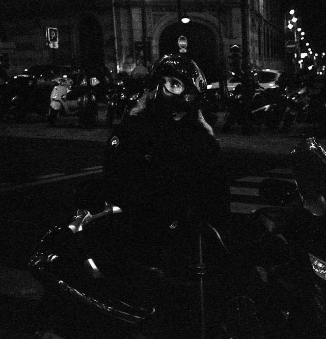 Night-time scooterist looking at Audrey Tatou poster. Place de Clichy, Paris 18. November, 2010.