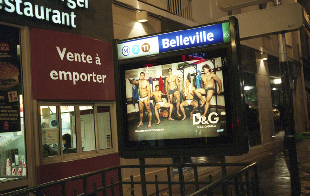 Belleville Metro and men in underpants, at night, Paris 10. April 2008.