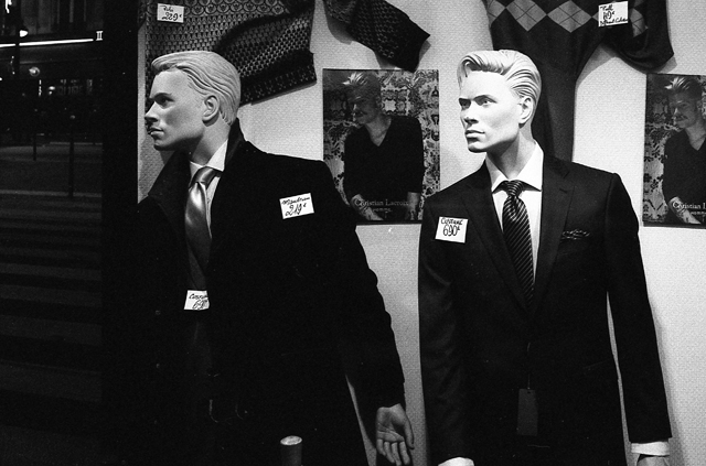 Male mannequins in night-time Montmatre shop window. Paris 18. November, 2010.