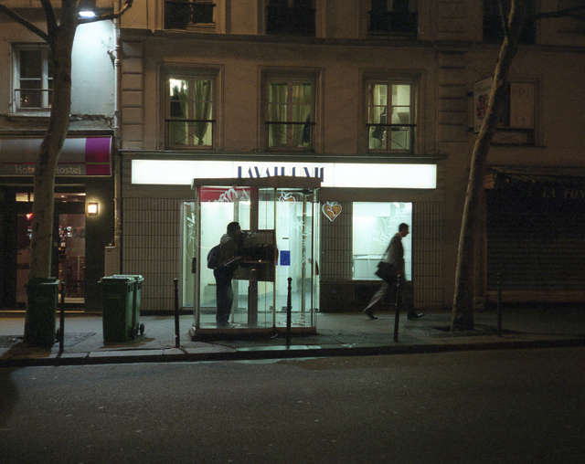 Man in night-time telephone booth, near Place de la Republique, Paris 11. January, 2008.