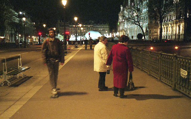 Skate-boarder and couple, night-time, Pont d’Arcole, Paris 4. January, 2008.