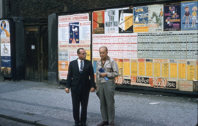 US Doc, on left, believed to be an orthpedic surgeon, in front of Communist Party street posters. Prague, July 1959