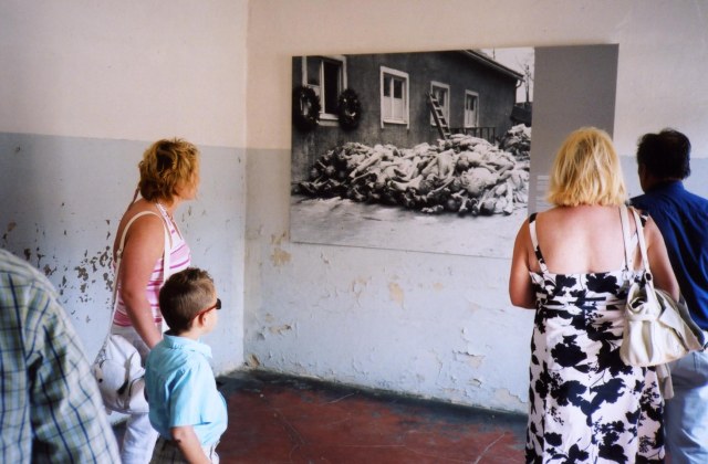 Crematorium ovens, a bouquet of flowers and a little girl, Buchenwald.
