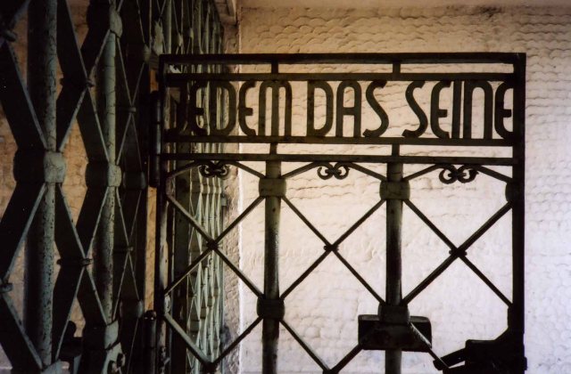 The main entrance gate to Buchenwald concentration camp: Jedem Das Seine – To Each His Own.