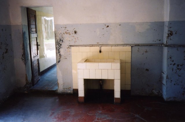 Floor of wash-up surgical area, crematorium complex, Buchenwald.