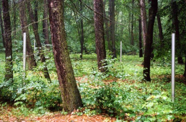 After the collapse of the DDR in 1990 poles were erected marking the mass graves of those who died  in the Soviet Camp No.2 Buchenwald. This wooded area is near the railway track that leads into Buchenwald Concentration camp.