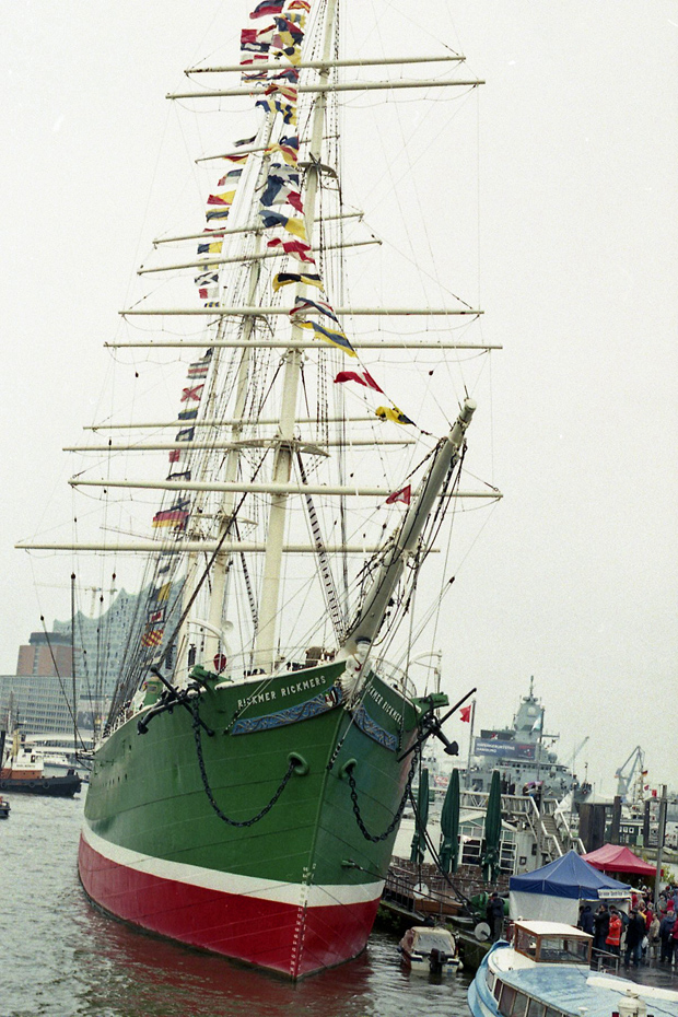 Elbe, Haben Geburtstag, May 2014. Rickmer Rickmers foreground, Hamburg Elbe concert hall/Elbphilharmonie Hamburg background.